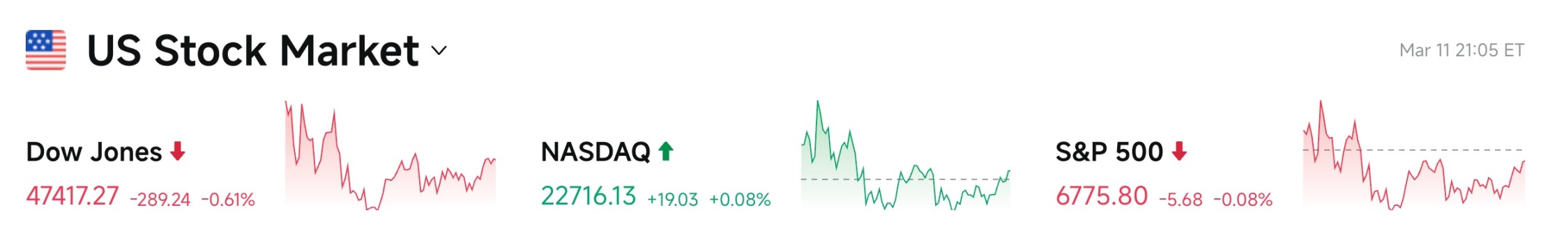 道指:跌 0.61% 报 47417.27 点,连续两日下行,受地缘冲突和油价上涨拖累能源外板块。