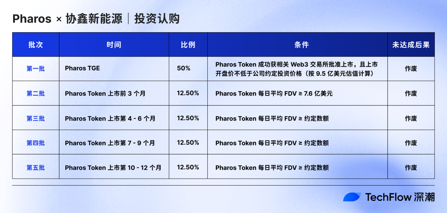 以最关键的第一批次为例,Pharos Token 成功上市且开盘达标后,Pharos 会立即向协鑫新能源交割 50% 的股份认购,同时协鑫新能源将以 9.5 亿美元的估值,收购价值约 9673 万港元的 Pharos Token。